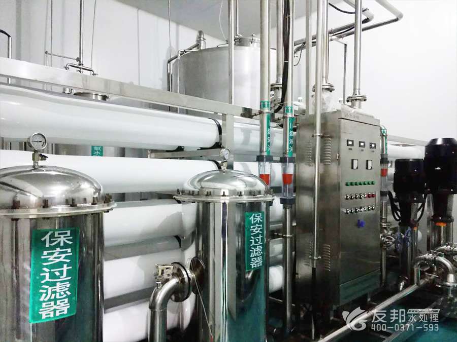 2、采用兩級反滲透方式,其流程如下:自來水→電動閥→多介質過濾器→活性炭過濾器→軟化水器→中間水箱→低壓泵→精密過濾器→一級反滲透主機→PH調節→混合器→二級反滲透主機(反滲透膜表面帶正電荷)→純水箱→純水泵→微孔過濾器→用水點
