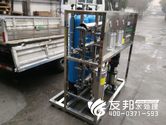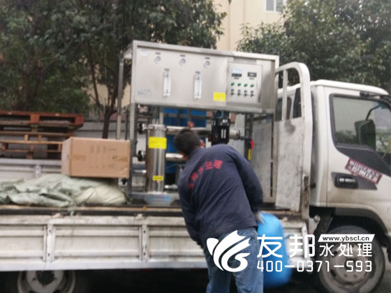 鄭州友邦生產的型號為YB-CJS-001每小時出水1噸采用高端反滲透技術的純凈水設備正在鄭州友邦西雅圖工業產業園內裝車發往河南濮陽地區用作食品冷卻水