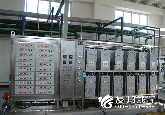 原水進入EDI裝置中后,水中的陰陽雜質離子被樹脂吸收。EDI單元兩端加有電壓,使進水的部分水分子分解成H+及OH-離子,這兩個離子進入樹脂層,置換出被樹脂吸收的雜質離子,這些雜質離子在左右陰極和陽極電流的吸引下分別向左右移動,即雜質陰離子被陽極吸引向陽極移動,雜質陽離子被陰極吸引,向陰極移動,并且通過陰陽離子交換膜進入濃水室,濃水室的廢水排出系統。這樣就完成了樹脂連續工作、連續再生的過程。